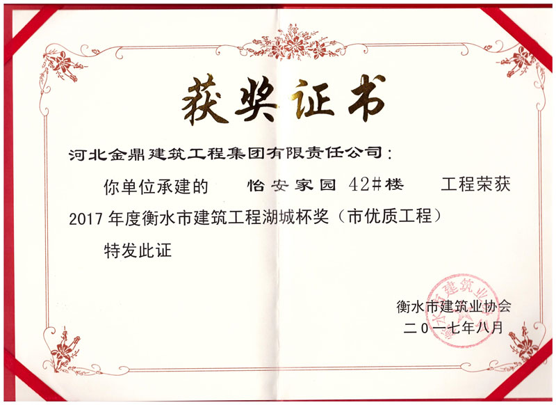 怡安家園42#樓工程榮獲2017年衡水市建筑工程湖城杯獎(市優(yōu)質(zhì)工程)