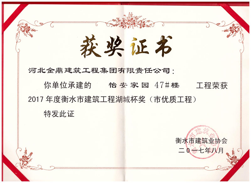 怡安家園47#樓工程榮獲2017年衡水市建筑工程湖城杯獎(市優(yōu)質(zhì)工程)